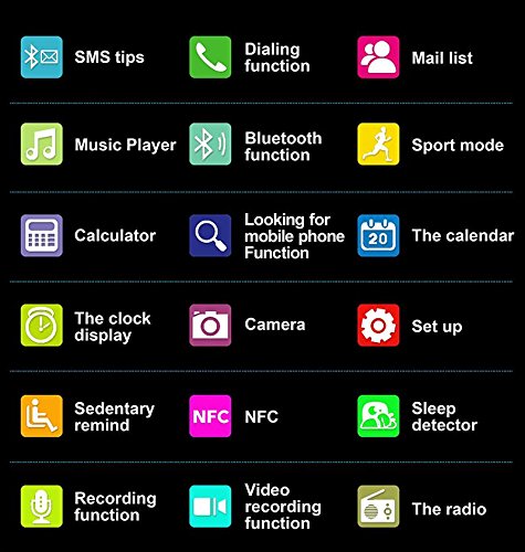 -. Feature : Acceleration sensor: 3D acceleration, step counting analysis sedentary reminder, sleep monitor, Anti lost, remote camera. / NFC Support: Adapt automatically and data sync. / language: English,French,Espanol,polski,Italiano,Portuguese,Deutsch,Dutch,Turkey,Russian. / Color: Black,White,Gold / Package Includes:1 x Smart Watch.1 x USB Charging Cable.1 x English Manual.