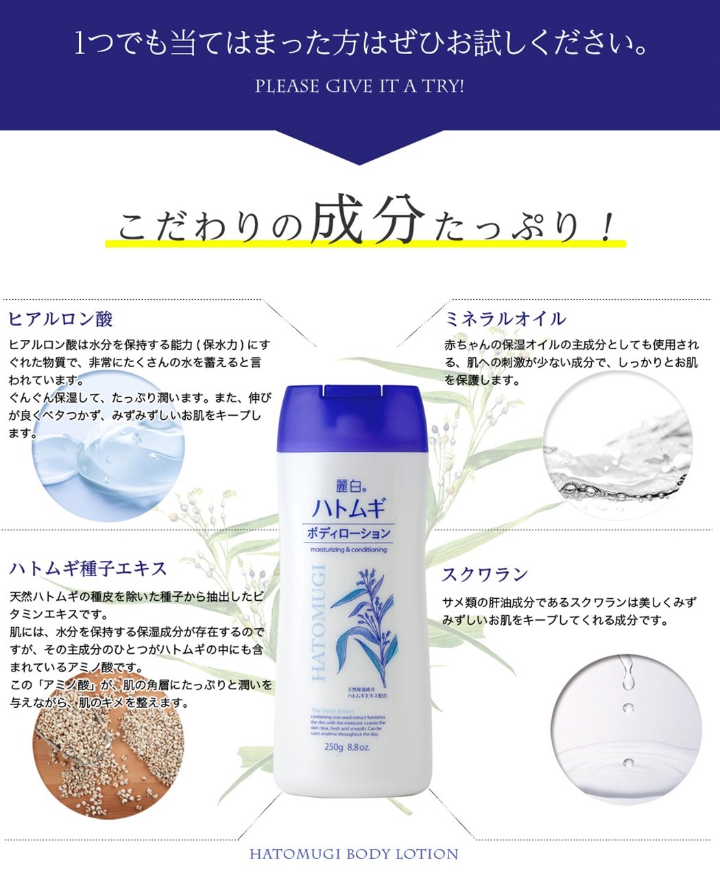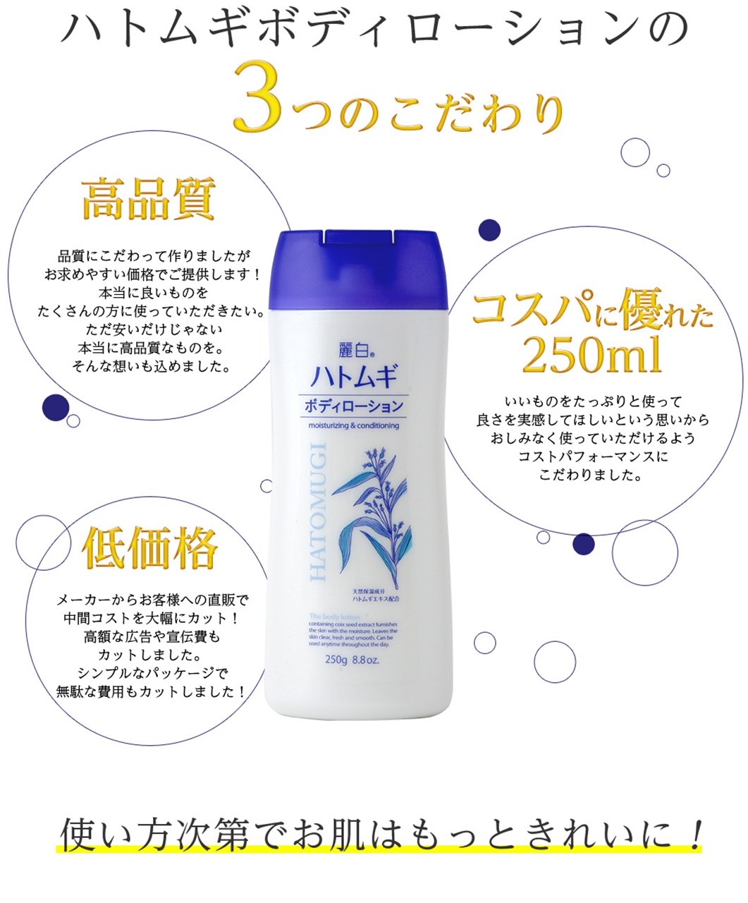 "Rei White Jat Body Lotion 250g" is a body lotion that contains natural moisturizing ingredients Jatomugi extract.
