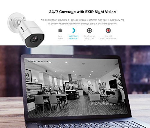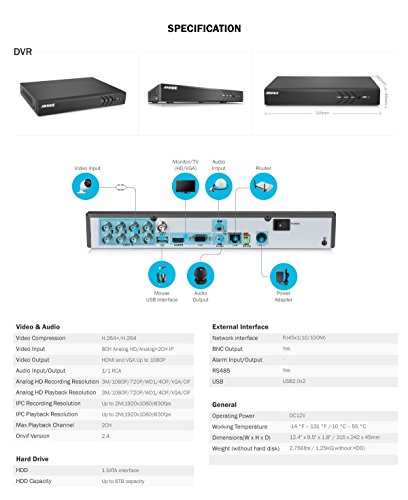 -. Feature : Ultra Clear 3MP video allows you to see close-up detail in everything the cameras captured. EXIR array LEDs cameras with smart IR providing up to 66ft/20m night vision in super clarity, IP66 weatherproof rating for indoor and outdoor use. / Free cloud storage, upload the alarming video clips and snapshots to the free Google Drive, OneDrive and Dropbox cloud to access them anytime anywhere. Free app for easy remote access on Android and iOS devices. Smart motion-triggered email alert with snapshots. / 1TB= 2TB, advanced H.264+ compression lowers the recording bitrate and bandwidth. Videos are now in a smaller size. Store more videos in the same HDD just like your storage is doubled. 5-in-1 DVR supports TVI/CVI/AHD/IP/CVBS video input. / S.M.A.R.T HDD detection, detect hard disk regularly and report HDD failure or bad sector timely if there is any. One-Key-Recording, click to start continuous recording or motion detection at once. Pattern unlock DVR system supports 20+ languages. / Smart video search and playback, mark out your own searching region to easily locate incident video clips and play them back with ease. Multiple smart detections include crossing line detection, invasion detection etc.