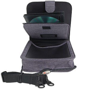 -. Feature : Grey design / Rubberized handle / Protective sleeves / Holds CD player / Wallet-style case stores and protects up to 8 CDs or DVDs / CD sleeves protect against scratches and dust / Stylish bungee cord keeps CDs securly in place