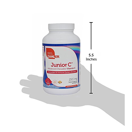 Zahler's chewable vitamin cis an Advanced Antioxidant and Immune booster. Vitamin C chewable is an essential nutrient that functions as a powerful antioxidant. Zahler's vitamin c for kids is water-soluble, which means a continuously replenishing supply is required. Vitamin C is needed to make collagen, the "glue" that strengthens the muscles and blood vessels. Vitamin C also plays an important role in wound healing, acts as a natural antihistamine, and protects against viral and bacterial infections. Junior C contains 250mg of PureWay-C® in a delicious tasting orange flavored tablet.Feature