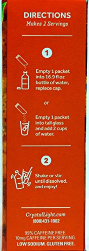 -. Feature : Each Box Contains 10 Individual Packets That You Mix With Up To 16.9 Fluid Ounces (500 ml) of Water / Each 8 Ounce (237 ml) Serving Contains 5 Calories / 99% Caffeine Free (10mg Per Serving) and Kosher / Low in Sodium and Gluten Free / Crystal Light On The Go has 90% Fewer Calories Than Leading Beverages
