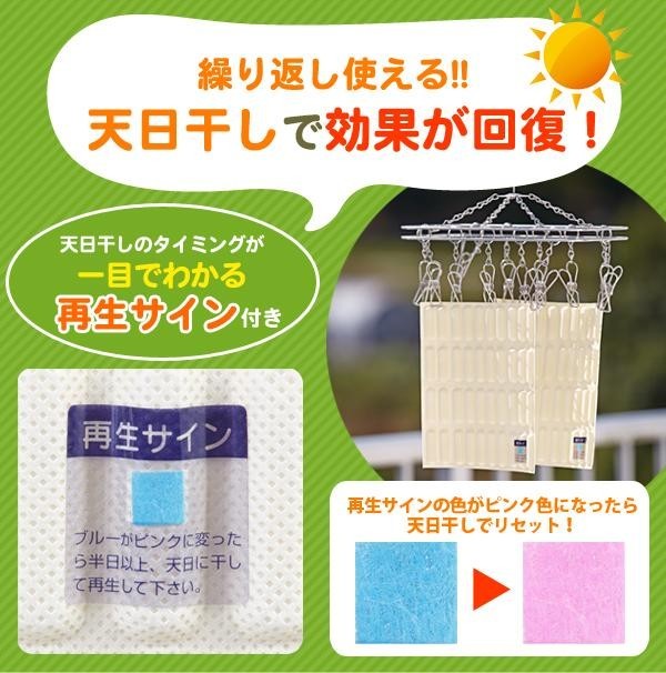 | 人気の「除湿&消臭」シリーズから、置き型ボックスタイプが登場!!湿気やニオイが気になる場所に置くだけでOK!!下駄箱やタンス、クローゼット、押入れ、シンク下など色々な場所で大活躍!!吊下げに便利なフック穴もついています。天日干しで効果が回復します!再生サインをチェックして繰り返し使いましょう♪ |