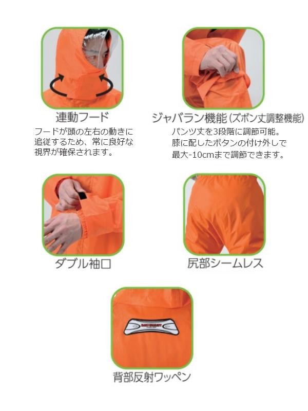 | 耐久性に優れた生地のレインウェア。 |