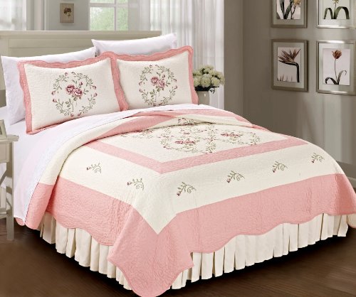 Serenta Classic Embroidery Prewashed Roses Microfiber Cotton Filled Bedspread/Quilt Blanket 3 Piece Bed Set, Queen, Light Pink