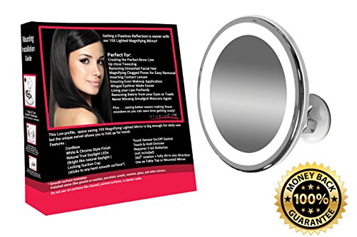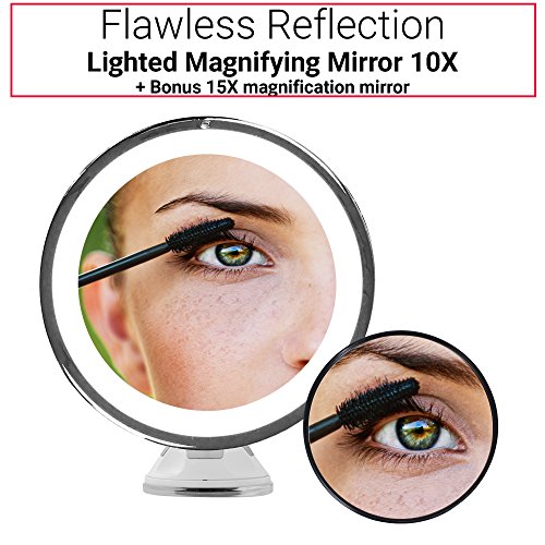 Lighted Makeup Mirror 10X Magnifying with True Daylight LED - Mount or Table Top - Touch + Dim - Cordless Home or Travel Vanity Bathroom Set w/ Bonus...