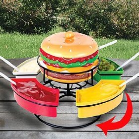 -. Feature : Revolving Lazy Susan Keeps All Condiments Within Reach / Holds Ketchup, Mustard, Relish and Mayo / Center Burger Bowl Works Great for Vegetables / No More Messy Bottles