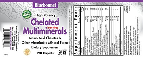 Bluebonnet's Albion Chelated Multimineral caplets are a high potency, fully reached amino acid chelate multimineral supplement formulated with advanced chelating agents. These include malates, citrates, and glycinates. Does not contain iron for individulas concerned with iron consumption. Available in easy-to-swallow caplets for maximum assimilation and absorption.Feature