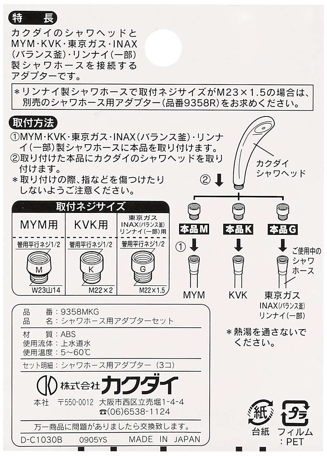 Kabutai shower head and KVK · MYM · Tokyo Gas · INAX (balance pot) adapter set for shower hose