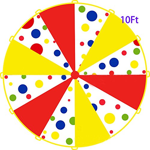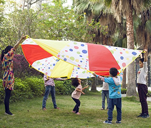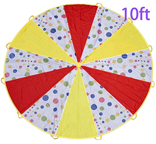 PARACHUTE SIZE: 10-feet diameter, 12 separate handles spaced evenly around for group play. Great at birthday parties, picnics,school(indoor or outdoor play), There are over 100 different games children can play with these playchutes