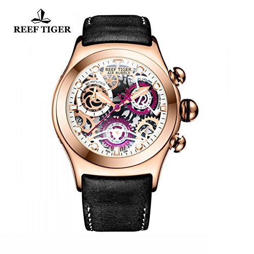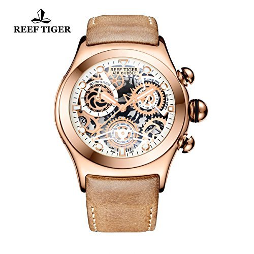 무브먼트: Japan SEIKO VK 68쿼츠 케이스:광택 스테인레스 스틸 도금 로즈 골드 크리스탈 긁힌 상처상 미네랄 크리스탈 베젤:고정 로즈 골드 베젤 다이얼:스켈리턴 다이얼,커다란superlumed핸드,화이트도트 마커 팔찌 가죽 스트랩 배치와 버클 방수50미터
