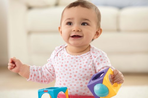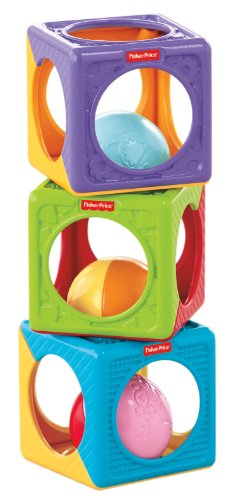 The Easy Stack 'n Sounds Blocks are a set of 3 oversized easy stack and easy grasp blocks that help strengthen baby's fine motor skills! Each block has bright colors, textures and sounds for baby to explore with a different animal face featured on each ball. The weighted ball inside each block helps to easily guide the blocks and stack on top of each other. And baby will love discovering the unique rattles and jingles inside each block as they shake!Feature