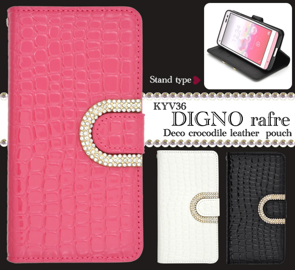 DIGNO rafre KYV36用のエレガントなデコクロコダイルレザーポーチケース。