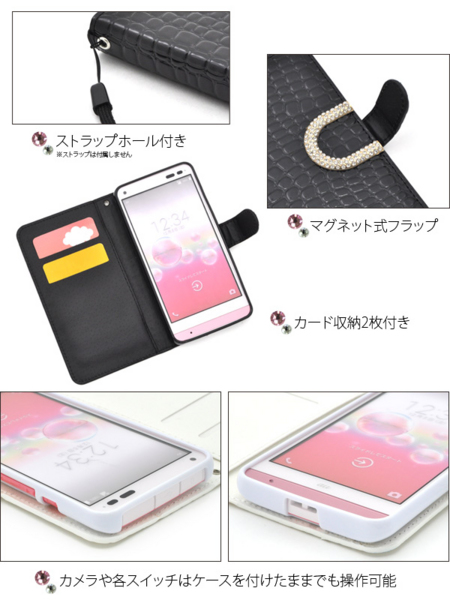 開閉はマグネット式で、使い勝手の良い手帳型です。またストラップホールもついています。