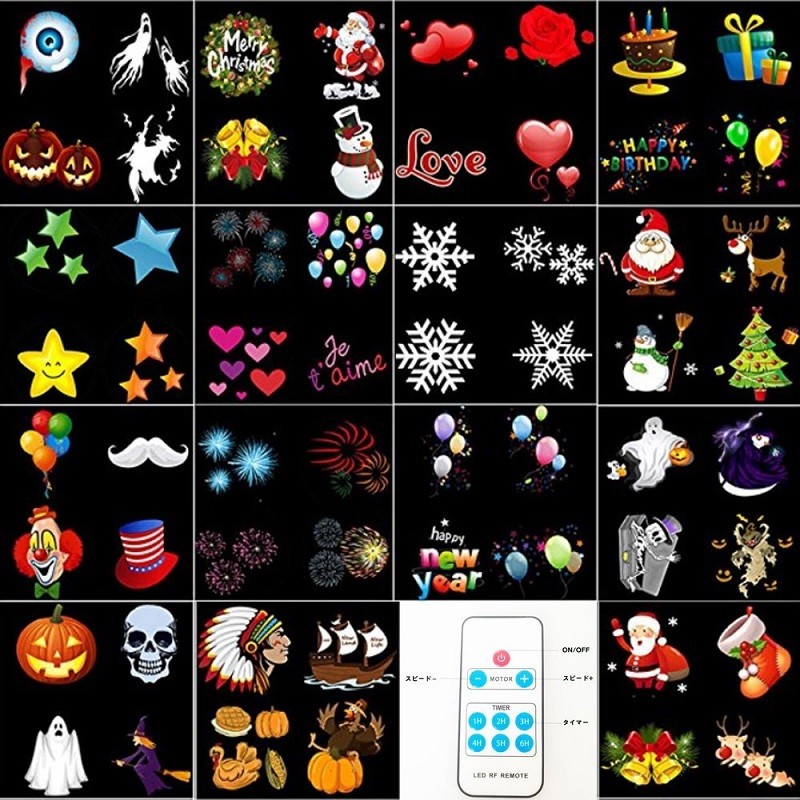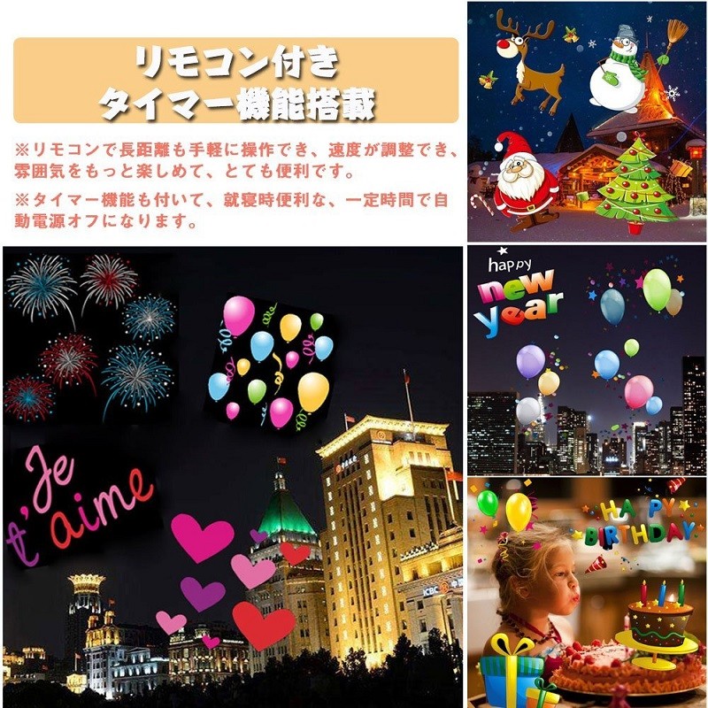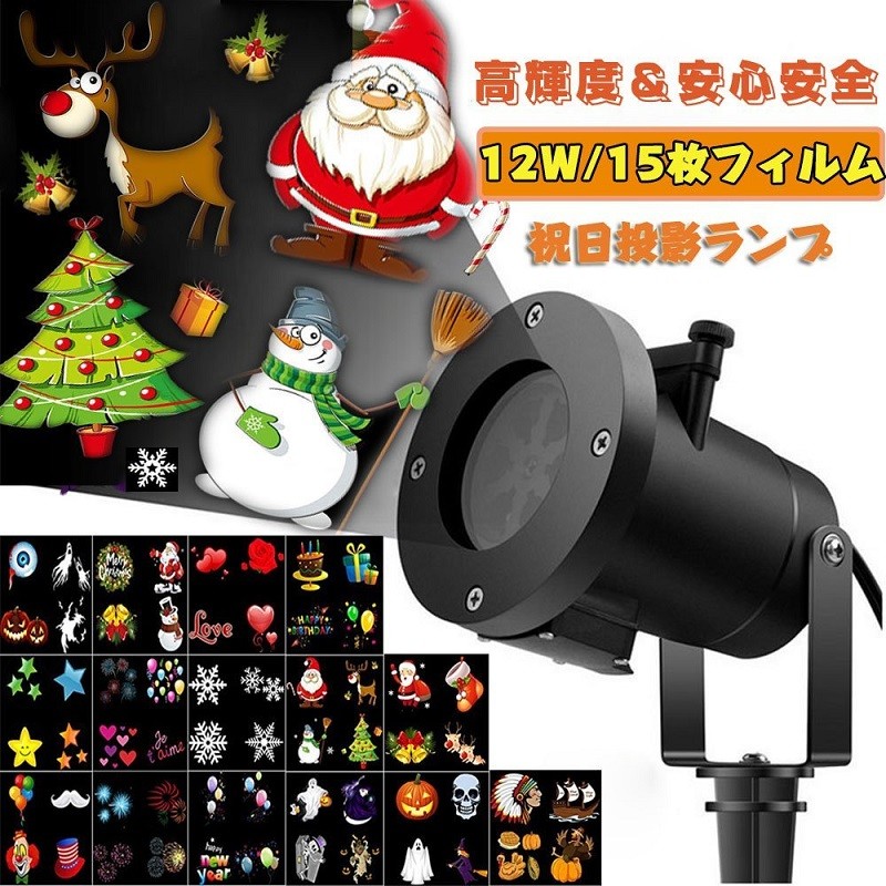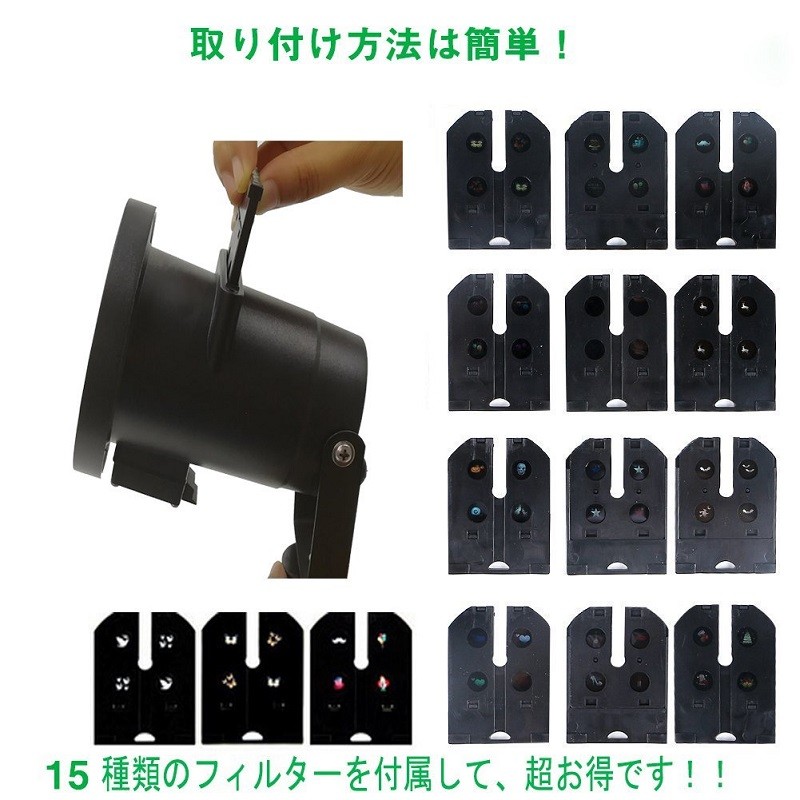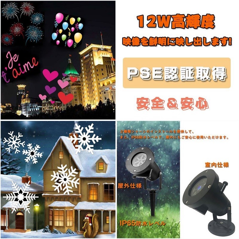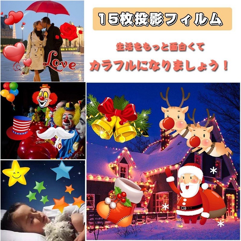製品仕様:材質:ABSパワー:12WLED数:4個*3W電源入力:AC100-240V / 50-60HZケーブル長:約5m適用温度:-25°-50°寿命:100000時間重さ:789g防水レベル:IP65認証:PSE、RoHS、CEパッケージ内容:1×プロジェクターランプ1×電源アダプター1×グランドステーク15xスライド(1つのスライドがプリロードされています)1xラウンドベース1xリモコン1 x取扱説明書【12W高輝度】12Wより高い解像度と明るさを持ったled プロジェクションライトで、鮮明な光でフィルムに描かれたイラストを映し出します。美しい光をスタイリッシュに演出し、ロマンチックな雰囲気を作ります。 【15枚特別カスタマイズ模様】クリスマスツリー、ハート、雪、ハト、誕生日ケーキ、サンタクロースなどの15パターン搭載、面白くてカラフルな雰囲気を作ります!ハロウィンやクリスマス、バレンタインデーなど、イベントを盛り上げるデザインから、日常生活をおしゃれに演出するデザインまで、シチュエーションに合わせて変更可能です。 【リモコン付き】本体のスイッチで操作だけでなく、リモコンで長距離も手軽に操作できて、速度が調整できるので、雰囲気をもっと楽しめて、とても便利です。さらに、タイマー機能も付いて、就寝時便利な、一定時間で自動電源オフになります。