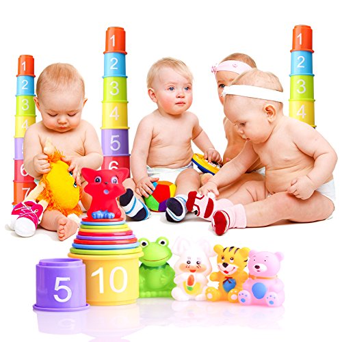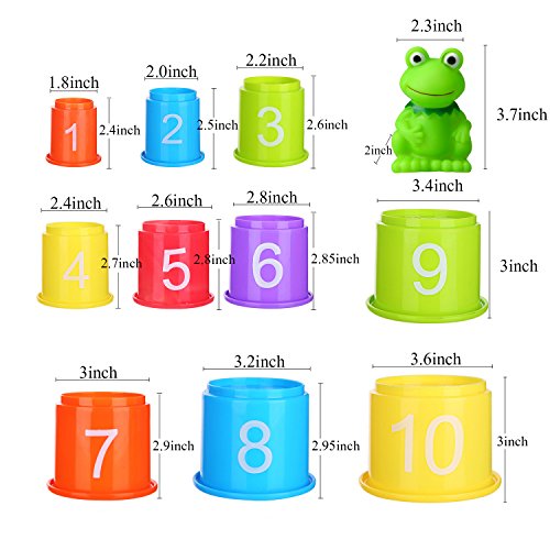 -. Feature : Made of quality material tested to be safe,100% meets toy safety standards.Safety and health, learning while playing. / This stacker toy includes 10 pieces progressively-sized cups and 1 piece randomly sent animal(include frog, rabbit, bear, tiger). / The 10 cups are marked with 1-10 numbers,help the baby early familiar with numbers, learn to count, while stacking the cup side can do math problems. / This toy is fun and challenges your baby's ability to stand up and stack them higher and higher in proper sizing order teaching them color and size is very educational. In the bottom of each cup there is an animal embossed with their eyes making it able to play it in the bathtub. / Can be played at home, in the bathtub, at the beach, a great addition in the playgroup and kindergarten classroom or at the therapist. If you take your kids with you at work, another reason to get this.