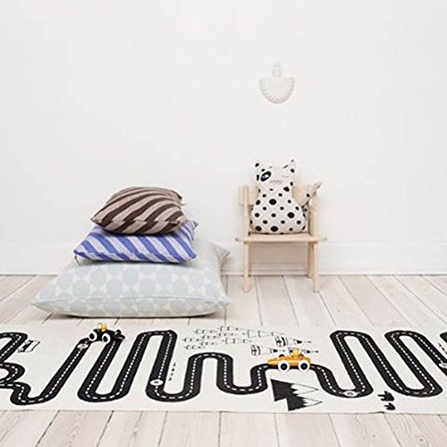 -. Feature : Canvas cotton / Size:70"L x 28"W(70cm x 175cm ); Real Color: Beige Yellow / Cotton canvas material, soft , safe and skin friendly / Cartoon Racing road lines pattern, draw baby's attention and interest / The game carpet can cultivate baby's thinking ability,visual crawling and intelligence