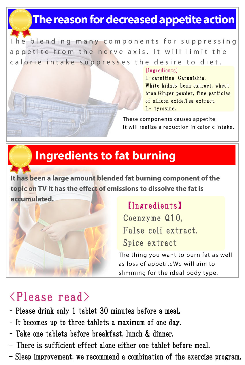 | Ingredients | L- Karunichinfumaru hydrochloric acid, Garcinia Cambodia, white kidney bean extract powder, wheat bran, ginger powder, coenzyme Q10, Coleus false coli extract powder, trehalose, cellulose, gelatin (pig-derived), calcium stearate, coloring (gardenia pigment, titanium dioxide) , fine silicon oxide, tea extract, spice extracts, L- tyrosine |