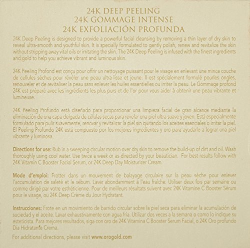 -. Binding : Health and Beauty -. Brand : Oro Gold -. EAN : 0609728454470 -. Feature : Purifies and cleanses the deepest pores of your skin / Moisturizes even the skin's deepest basal layer / Will not cause damage to the skin / Gently polishes your skin by removing the dead skin cells on the surface / Lifts out dirt without stripping away vital oils -. Label : ORO GOLD WORLDWIDE -. Manufacturer : ORO GOLD WORLDWIDE -. MPN : 609728454470 -. NumberOfItems : 1 -. PackageQuantity : 1 -. PartNumber : 609728454470 -. ProductGroup : Beauty -. ProductTypeName : BEAUTY -. Publisher : ORO GOLD WORLDWIDE -. Size : 3.38 fl ounce -. Studio : ORO GOLD WORLDWIDE -. Title : Oro Gold 24K Gold Deep Peeling -. UPC : 609728459185