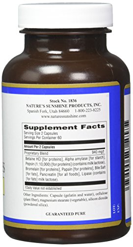 ReleaseDate : 2016-04-04 Studio : Inventory Management Services- HPC Publisher : Inventory Management Services- HPC Binding : Health and Beauty Product Description How It Works: Enzymes break down food into compounds for absorption into the bloodstream. This combination of enzymes offers more complete digestive support when taken with meals. This formula includes pepsin, which is used for pre-digesting proteins in the stomach. Betadine HCl helps create an acidic environment to facilitate the activity of pepsin. After food reaches the small intestine, the enzyme pancreatin further digests protein, carbohydrates and fats in the small intestine. Pancreatin also helps to support the pancreas. Alpha amylase digests starches. Bile salt makes fats soluble, preparing them for further digestion by lipase. The enzymes bromelain and papain aid in the digestion of proteins. Bromelain also offers other health-related benefits, including relaxing smooth muscles and supporting joint health. Taken between meals, Food Enzymes works systemically to break down proteins associated with joint health, arterial health and immune activation. One capsule will help you digest a minimum of 30 grams of protein, 30 grams of carbohydrates and 20 grams of fats. Ingredients: Betadine HCl, bile salt, bromelain, lipase, alpha amylase, pancreatin, papain and pepsin 0
