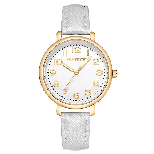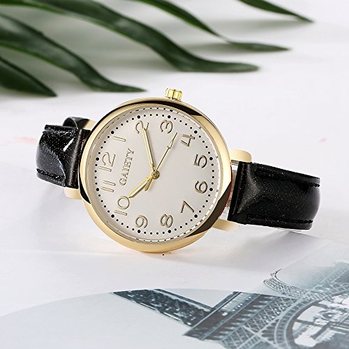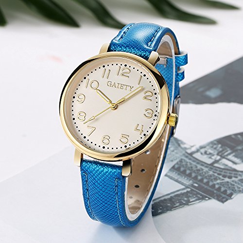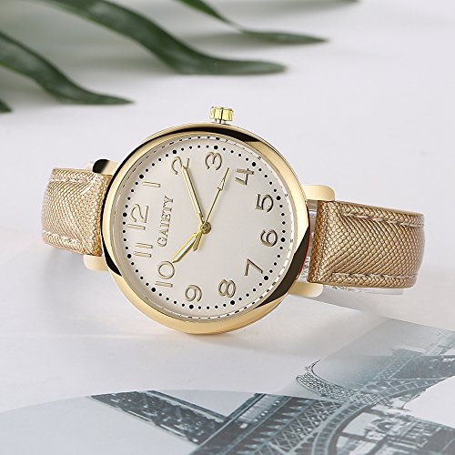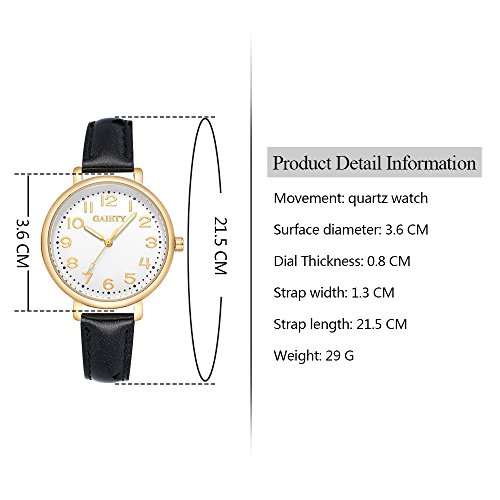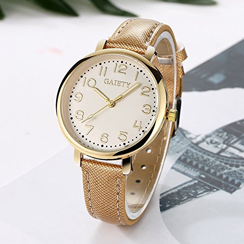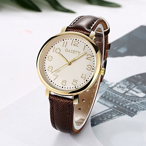 -. Feature : Diameter 1.4 inch gold tone case with full Arabic numbers display / 0.63 inch wide, 9.45 inch long leather band with classic buckle / Analog quartz movement for time-keeping / Best gifts for women/girls in Christmas, birthday, Mother's Day, Valentine's Day, wedding etc. / 30m water resistant, withstands for hand and face washing, not suitable for diving, bathing, swimming