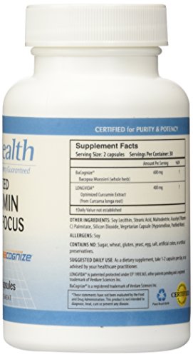 -. Feature : Longvida Optimized Curcumin Extract (from Curcuma longa root) with BaCognize Bacopa Monnieri (whole herb) / Serving Size: 2 capsules. Servings per Container: 30. / Sested Use: As a dietary supplement, take 1-2 capsules per day, or as advised by your healthcare practitioner. / Sugar free, wheat free, gluten free, egg free. / Contains No: salt, artificial colors, or artificial preservatives.
