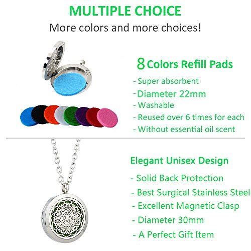 - 🌼 PROCESS TO USE - The stunning flower pendant oil diffuser jewelry complete with warranty card, ideal for gift giving. 8 washable, absorbent and reusable felt diffuser necklace pads in a variety of colors. Take 3-5 drops your favourite perfume on the pads,worn as both a statement jewelry piece and aromatherapy diffuser, so you can enjoy the aroma of your favorite essential oil, for up to 3 days!