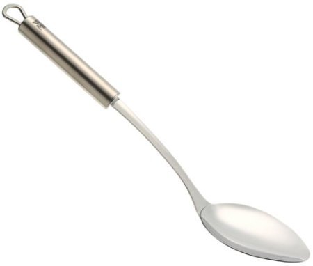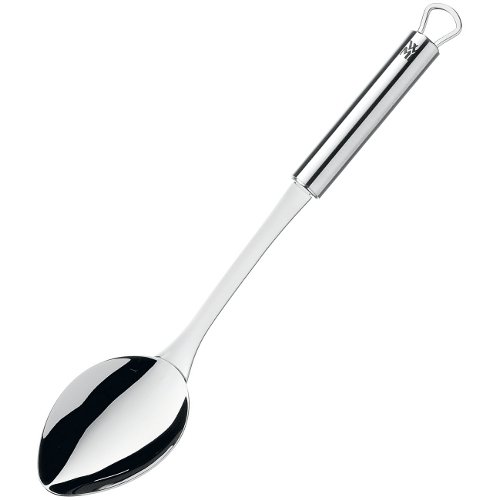 Amazon.com This solid serving spoon is just one of the high-quality Profi Plus tools WMF makes for every conceivable kitchen task. Shaped to serve food in the kitchen or dining room or to stir foods on the stovetop, the 12-1/2-inch spoon is contemporary European in style. It's made of 18/10 stainless steel and is beautifully balanced, with a satin-finish, cylindrical handle, a heavy-duty hanging loop, and a highly polished shaft and bowl. Seamless construction ensures cleaning ease. This tool is dishwasher-safe, durable, and a joy to use for serious cooks and novices alike. --Fred Brack 0