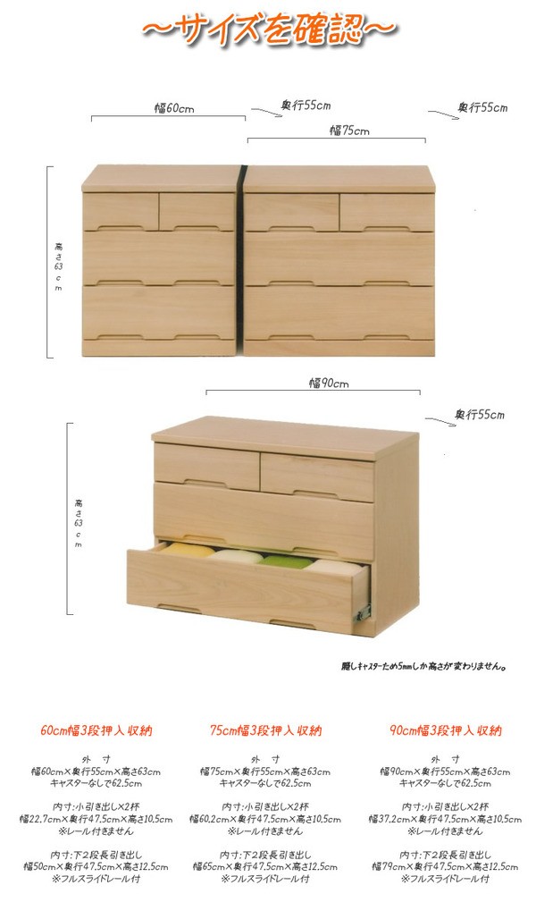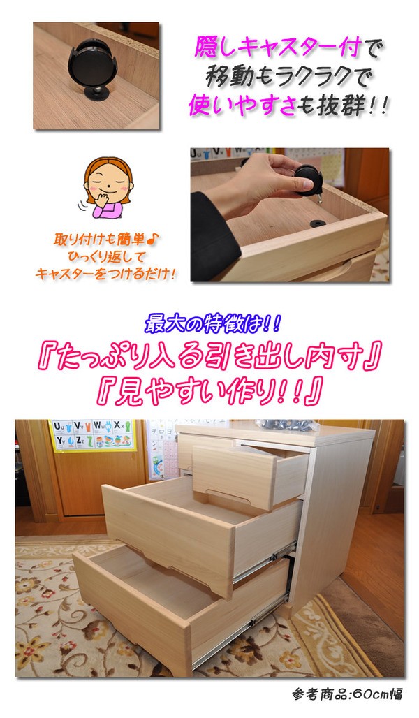 【商品名】押入れ収納タンス/衣類収納チェスト 【3段 幅60cm】 ナチュラル キャスター付き 日本製 【完成品】