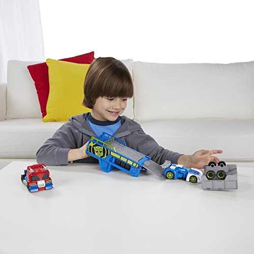 -. Feature : Trailer converts into a vehicle launcher / Easy 2 do conversion / Features 2 converting bots - Optimus P.R.Ime and Blurr / Vehicle launcher is compatible with Rescue Bots Rescan figures / Trailer's base separates to become a ramp for stunt play / Includes trailer, Optimus P.R.Ime, and Blurr figures