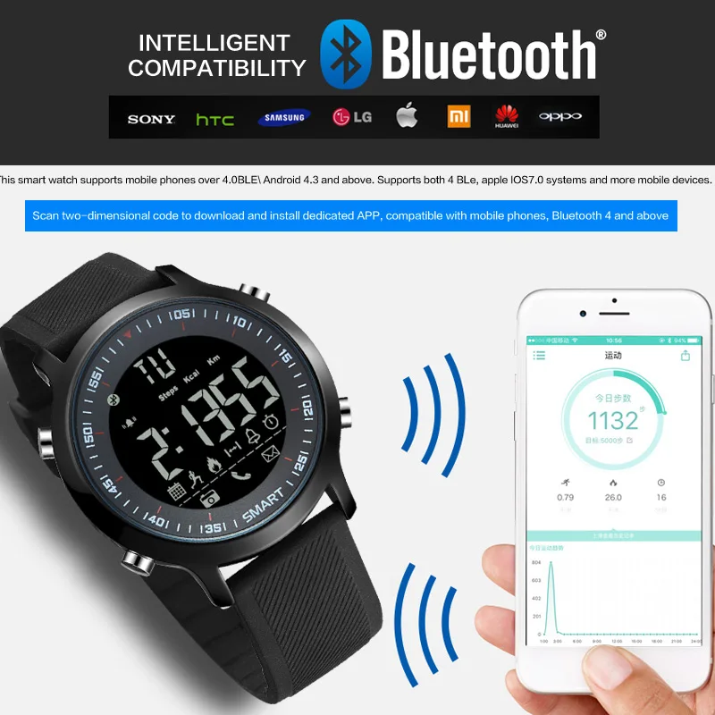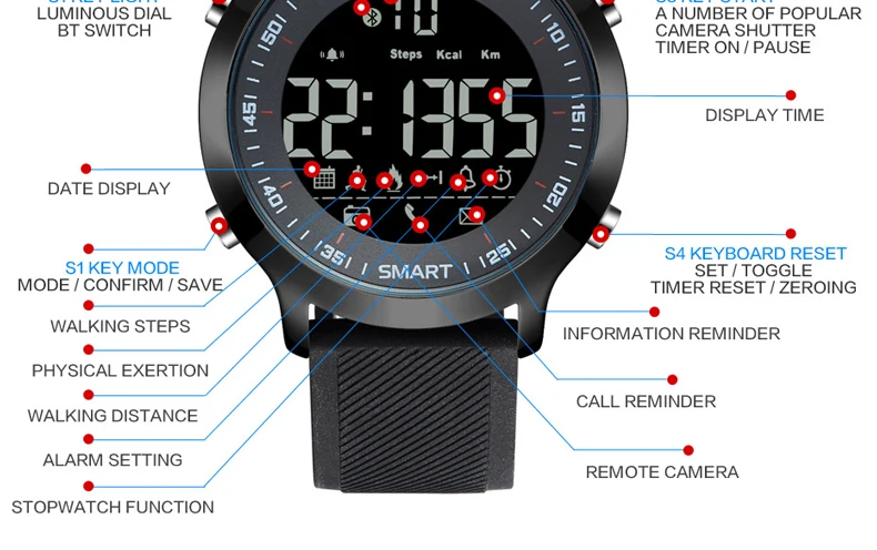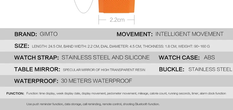 Feature:Water Resistant,LED display,Luminous,Stop Watch,Back Light,Complete Calendar,Shock Resistant,Call Reminder,Bluetooth,Auto Date,Alarm,Swim