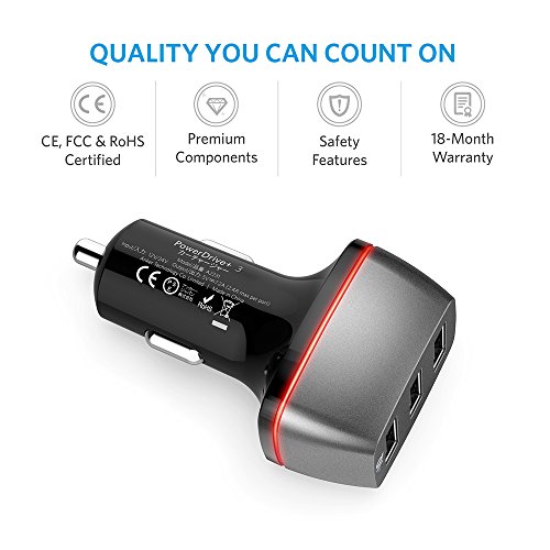 Anker 36W 3-Port USB Car Charger, PowerDrive 3 for iPhone 7 / 6s / Plus, iPad Pro / Air 2 / mini, Galaxy S7 / S6 / Edge / Plus, Note 5 / 4, LG, Nexus, HTC and More - Black