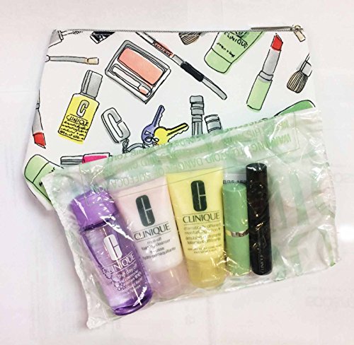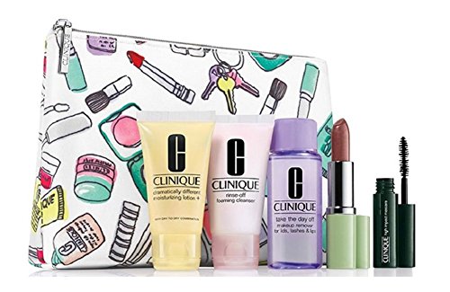 Studio : Estee Lauder Publisher : Estee Lauder Binding : Misc. Product Description Set contains; - Clinique Dramatically Different Moisturizing Lotion Tube, 1oz/30ml - Clinique Take the Day Off Makeup Remover, 1.7.fl.oz/50ml - Clinique Rinse-Off Foaming Cleanser, 1oz/30ml - Clinique High Impact Mascara - 01 Black, 0.14oz/3.4ml - Clinique Different Lipstick - Bamboo Pink, full size - Pouch (Size: W 9 inch x H 5.5 inch) 0