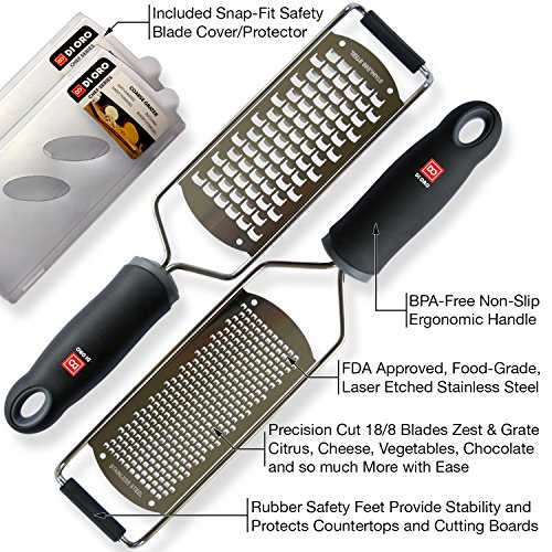 - PRO-GRADE RAZOR-SHARP BLADE MAKES IT EASY TO ZEST & GRATE - The finest precision-cut FDA Approved food-grade 18/8 Stainless Steel blades have non-slip rubberized tips for added control and safety. The blades are large and shaped to let you quickly zest and grate with ease!
