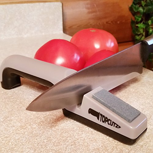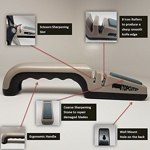 Top Cutz Knife Sharpener, 3 in 1 Sharpening Tool, Best New Design, Includes 8 Honing Wheels for a Sharp Edge, Built in Coarse Sharpening Stone to Repair Damaged Blades, Special Slot for Scissors