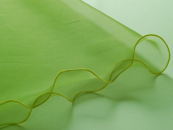 さまざまなバリエーションをお楽しみいただけるリーフデザインです。(えんぴつのように両端がとがっています) シンプルなオーガンジーショールですが、贅沢にバイアスで裁断し、ふちが波打つようにデザインしています。