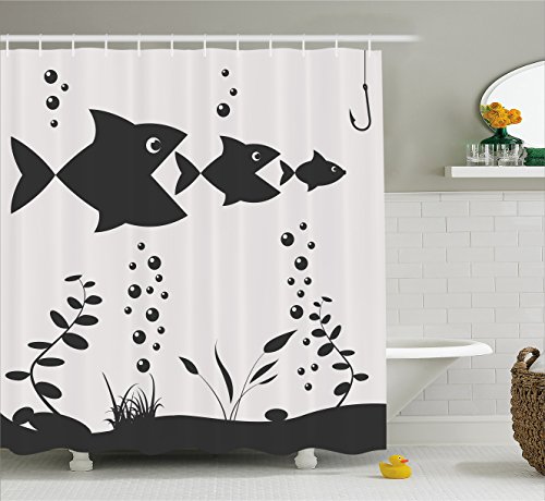 Fishing Decor Shower Curtain by Ambesonne, Big Fish Eats Little Themed Image with Tree Fish in a Row Bubbles Coral Reef, Fabric Bathroom Decor Set with Hooks, 70 Inches, Grey Beige