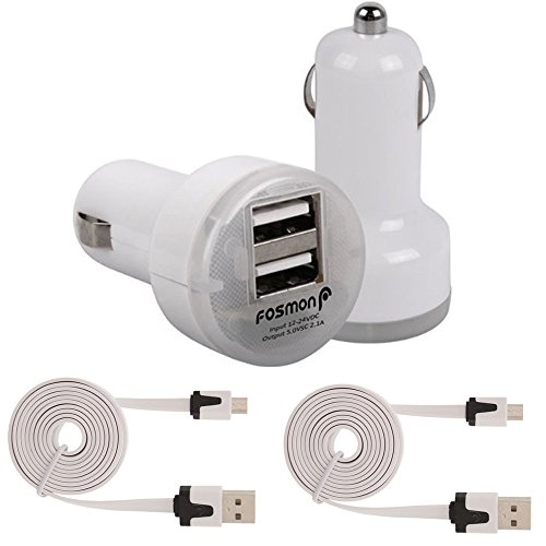 -. Feature : Dual Port USB car charger charges any of your devices while driving. LED's confirms whether USB charger is properly connected / Dual Port Design - 2.1A port for iPad and tablets and 1.0A port for mobile phones or other devices. Circuit board design automatically switches to saver mode, so charging will automatically stop when battery is full. / Micro USB Flat cable that is lightweight, compact design and portable - 3 Feet / Lay flat design to avoid tangled cords and helps to save space. High speed USB 2.0 provides fast data speed while charging your devices. / Includes: 1x Fosmon Dual Port USB Car Charger, and 2x of Fosmon Vivid Micro USB Flat Cable 3ft