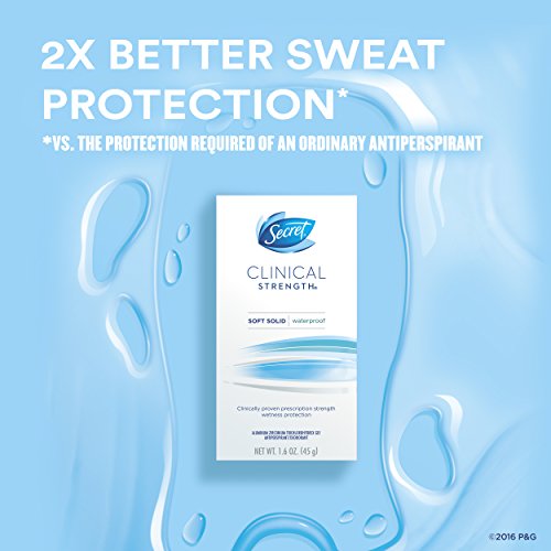 Never let them see you sweat! Did you know that heat, activity, and stress can all cause you to sweat and that stress sweat smells the WORST? That's because stress sweat comes from a different gland, causing more bacteria and more odor. That's why Secret Clinical Strength is clinically stress-tested and fomulated with 4X the stress-sweat protection* to help stop sweat and odor before they start. Secret Clinical Strength has 2X better sweat protection,* giving you clinically proven, prescription-strength protection. Secret Clinical Strength Soft Solid is formulated with skin-soothing conditioners to minimize irritation and soothe dry, tender underam skin, while its Waterproof scent delivers a revitalizing aroma all day long. Secret Clinical Strength offers the wetness protection of a prescription-strength product but with less irritation, making it perfect for everyday use. Secret Clinical Strength Soft Solid—superior protection to take on even the most stressful days. *Vs. the protection required of an ordinary antiperspirantFeature