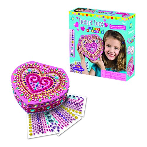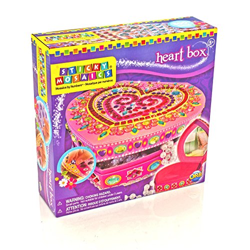 You're going to fall in love with this new heart shaped box! Punch up the glam with color and jewels and it becomes the perfect place to stash all your favorite trinkets and treasures - simply decorate by number with hundreds of sparkling jewel stickers. Orb Factory's Sticky Mosaics line of decorate-by-numbers craft kits continue to delight crafters young and old. These easy to do projects let you create your own craft masterpieces. Your completed Sticky Mosaic Heart Box is a perfect place to store all your valuable jewelry. Includes a heart shaped box with mirror and felt and 500+ sparkling jewel stickers. New for 2010.