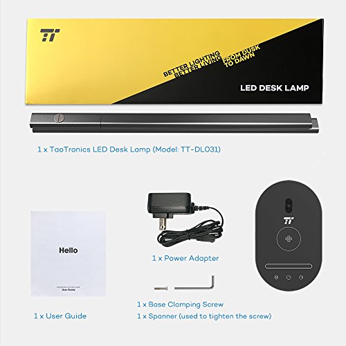 What's In the Box: 1 x TaoTronics LED Desk Lamp (Model: TT-DL031) 1 x Base Clamping Screw 1 x Spanner (used to tighten the screw) 1 x Power Adapter 1 x User Guide