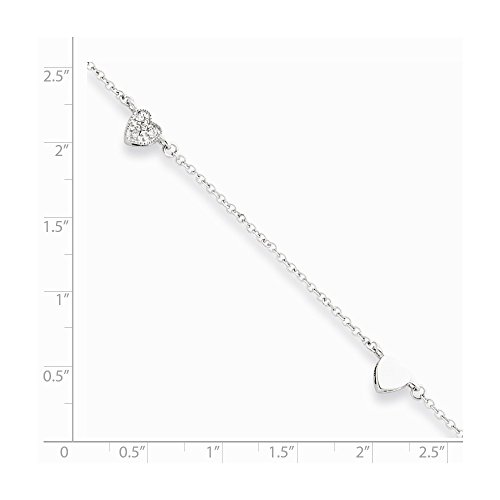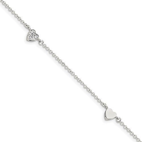 Solid 925 Sterling Silver 9 1in ext Polished & CZ Cubic Zirconia Hearts Anklet 9" - with Secure Lobster Lock Clasp (7mm)