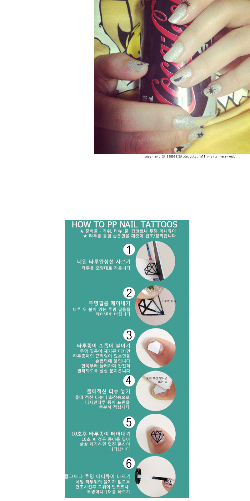 네일타투를 하신후 탑코트나 투명 메니큐어를 발라 주시면 지속기간이 길어집니다