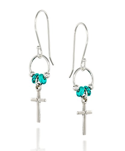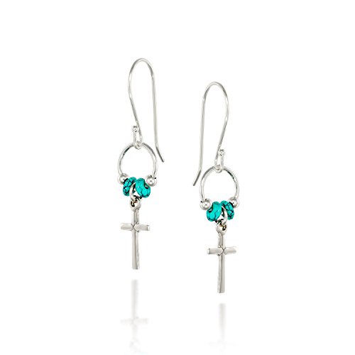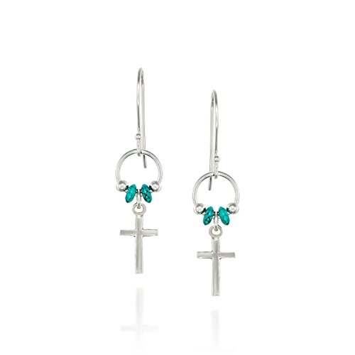 Dainty Sterling Silver cross earrings with reconstituted Turquoise bead accents. 925 Sterling Silver cross dangle earrings with rondelle reconstituted Turquoise beads. The small Silver cross measures about 7/16" in length. The cross is accented with two 2 by 4 reconstituted Turquoise beads. Artisan handmade.