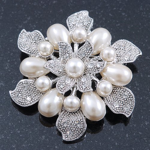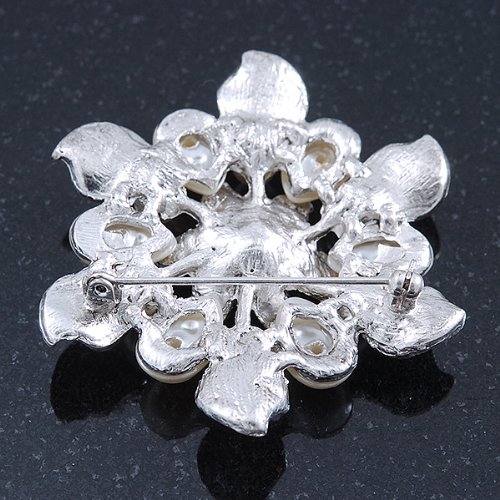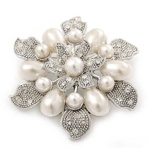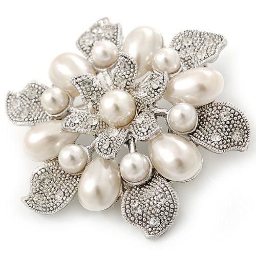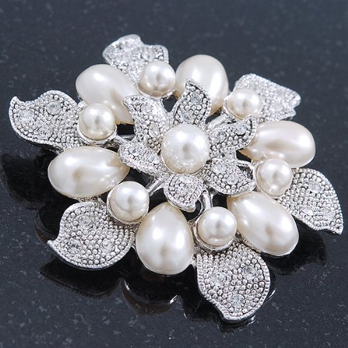 Vintage inspiration gives you of-the-moment thrills. This ultra-feminine piece seamlessly incorporates old Hollywood glamour into your everyday style. Featuring a layered flower design, crafted in rhodium plated metal and decorated with white glass pearls and small clear Swarovski crystals for a dash of sparkle. The brooch measures about 55mm in diameter. Secures with a flag pin and revolver clasp. This stunner would make an exquisite gift for someone special and would look just divine pinned at the waist of a vintage style wedding gown. This product does not contain any natural pearls.Feature