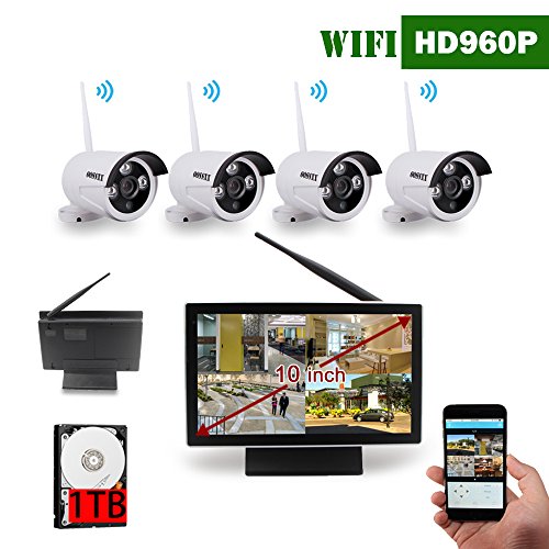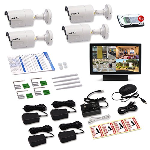 10 inch Screen OOSSXX HD Wireless Video Security Camera System,4 pcs 960P Megapixel Wireless Weatherproof Bullet IP Cameras,Plug and Play,70FT Night Vision,P2P,App, 1TB HDD Pre-install