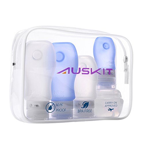 AusKit Leak Proof Travel Bottles Set, 4 Refillable TSA Approved Silicone Travel Containers For Liquids with Silicone Cream Jar and Clear EVA Toiletry Case