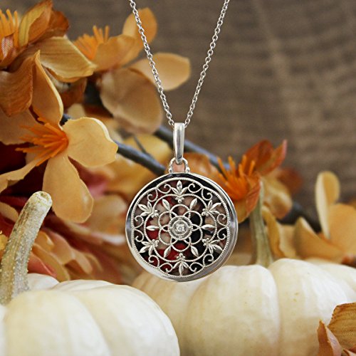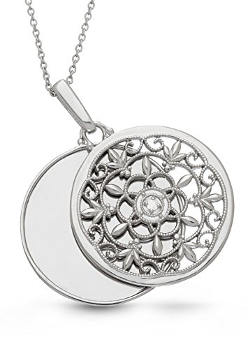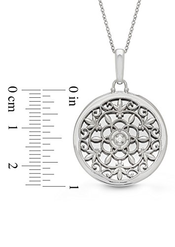 Like an intricate fence concealing a secret garden, Birdie provides a glimpse of a loved one behind her filigree. Punctuated with a petite diamond, this keepsake is classic and timeless. Our Birdie custom silver locket was inspired by an extraordinary woman. Big Bird was a bold, generous matriarch in the true sense of the word. Her arms were open, her opinions heard, her parties spectacular and her family adored. Our dear friend, Lawrie Firestone, lost her Mom last year after a short battle with cancer. We adored her large spirit and named this locket in Big Bird's memory. Her close knit family carries her with them every day and strives to live up to the long shadow she left behind. The center of the design fans out in filigree, just as she was the center of her family providing a beautiful platform for their lives to thrive. 10% of the proceeds of this keepsake locket are donated to the Breast Cancer Research Foundation. Locket measures 40 x 27mm. Includes Sterling Silver locket pendant with .03 diamond CTW. and sterling silver chain. Available in chain lengths from 18" to 36". Our 18" through 34" necklace chains come standard with a 2" jump ring which may be used to shorten the chain by 2" and allows two length options.Feature