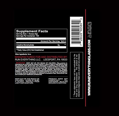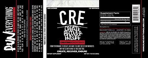 -. Binding : Health and Beauty -. Brand : Run Everything Labs -. EAN : 0728028405842 -. Feature : Creatine is a nitrogenous organic acid which supplies energy to cells within the body. / Muscles make use of creatine as it increases the formation of ATP, their fundamental source of power, and is also utilized by the brain. / Creatine improves the physiological response to resistance exercise, increasing the maximal force production of muscles in both men and women. / A meta analysis found that creatine treatment increased muscle strength in muscular dystrophies, and potentially improved functional performance. It has also been implicated in decreasing mutagenesis in DNA. / Creatine Monohydrate specifically is preferable to Creatine Phosphate because the latter does not pass through cell membranes. -. IsAdultProduct : 0 -. Label : Run Everything Labs -. Manufacturer : Run Everything Labs -. PackageQuantity : 1 -. ProductGroup : Health and Beauty -. ProductTypeName : HEALTH_PERSONAL_CARE -. Publisher : Run Everything Labs -. Studio : Run Everything Labs -. Title : CRE | Create Recover Endure | Creatine Monohydrate | Run Everything Labs | 500 grams | 100 Servings -. UPC : 728028405842