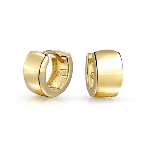These gold plated huggy hoop earrings may be small in size, but they manage to pack a big fashion punch. Shiny and polished, a new pair of small hoop earrings will suit any mood any day of the week and add a touch of class to your already chic style. Simple but sophisticated design, our sterling silver huggie hoops are neat, chic and smart. From a day at the office to a night our on the town, your new shiny gold plated huggie hoops will go everywhere with you and help to bring your style full circle. Each gold plated wide huggie hoop earring opens on a hinge and snaps firmly back into place to fit snugly in each ear. They are lightweight and have a comfortable wearing feel. When you are looking in your jewelry box for a pair of go to everyday gold plated hoops, you will find yourself reaching for these huggy hoops over and over again. Order these today and help complete your chic look.Feature